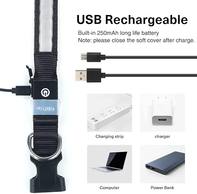 Equipped with ultra-bright LED lights and multiple glow modes (steady, slow flash, and fast flash), you can customize the lighting to suit your environment. The collar is USB-rechargeable, eliminating the need for batteries and providing hours of illumination on a single charge.